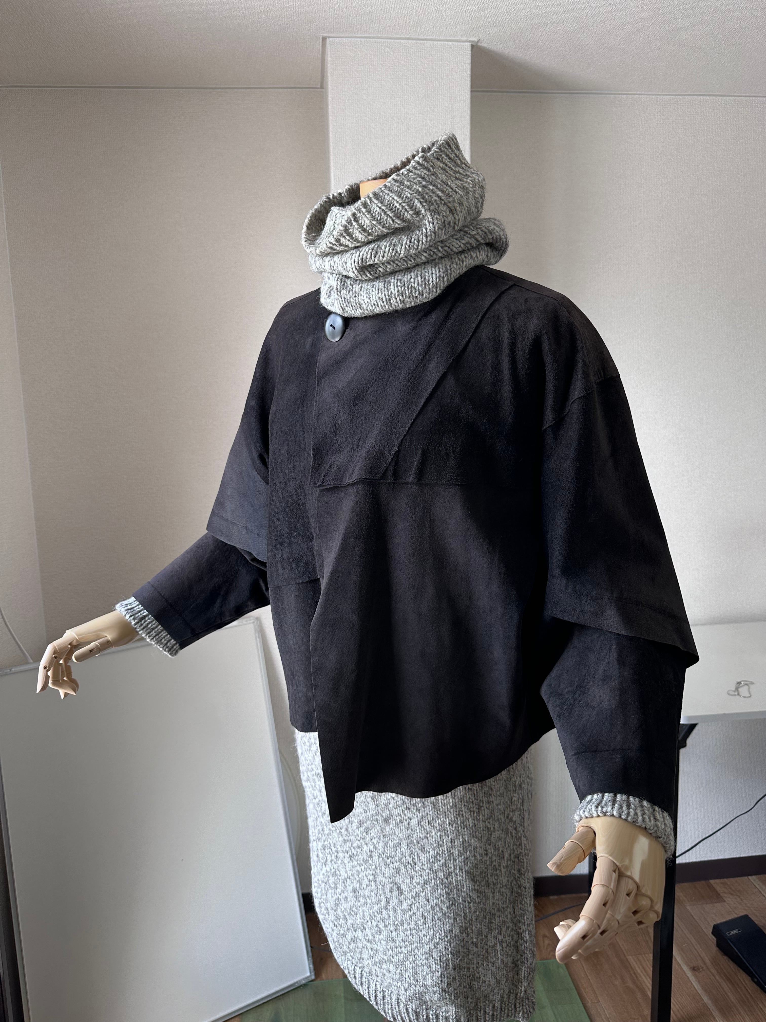 使い心地としてはレザーボレロみたいな感覚になるのですが、サイズ感が意外と大きくって、しかもメンズ服なのか左前の合わせ。