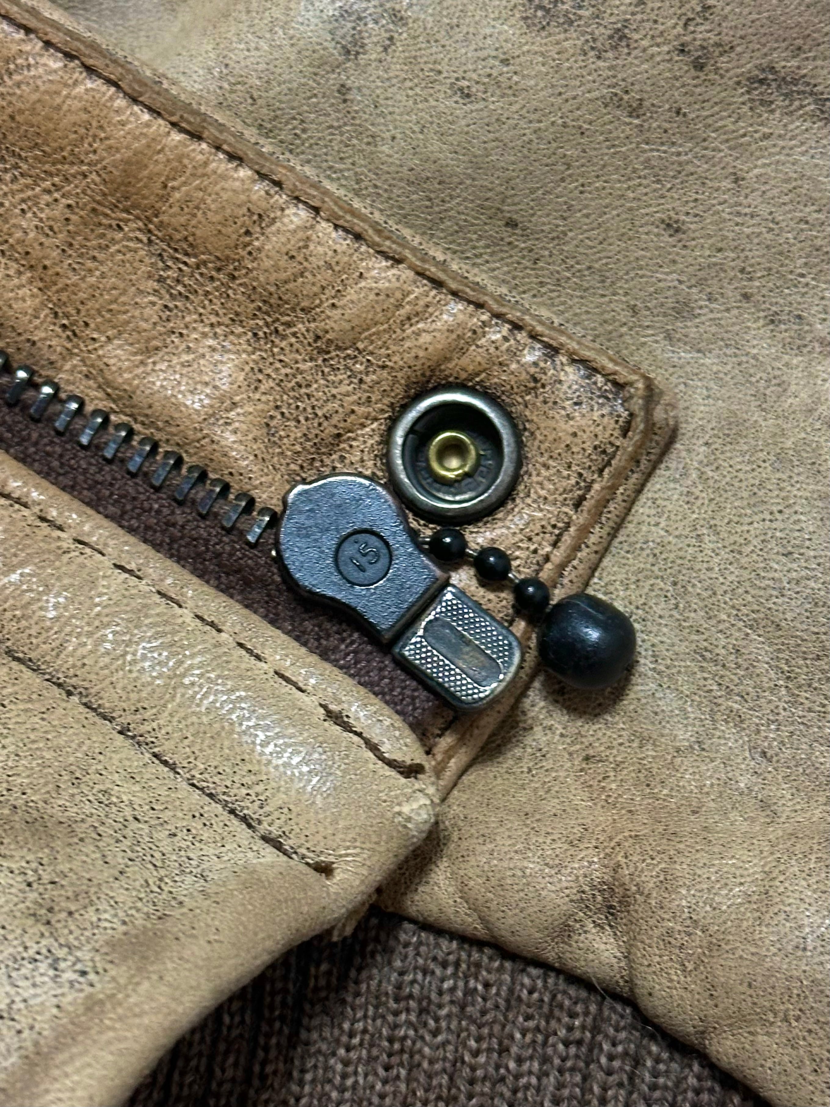 元となる革色は恐らくブラウンなのでしょうけれど、加工で脱色じみた褪色をされた退廃的ビジュアル。