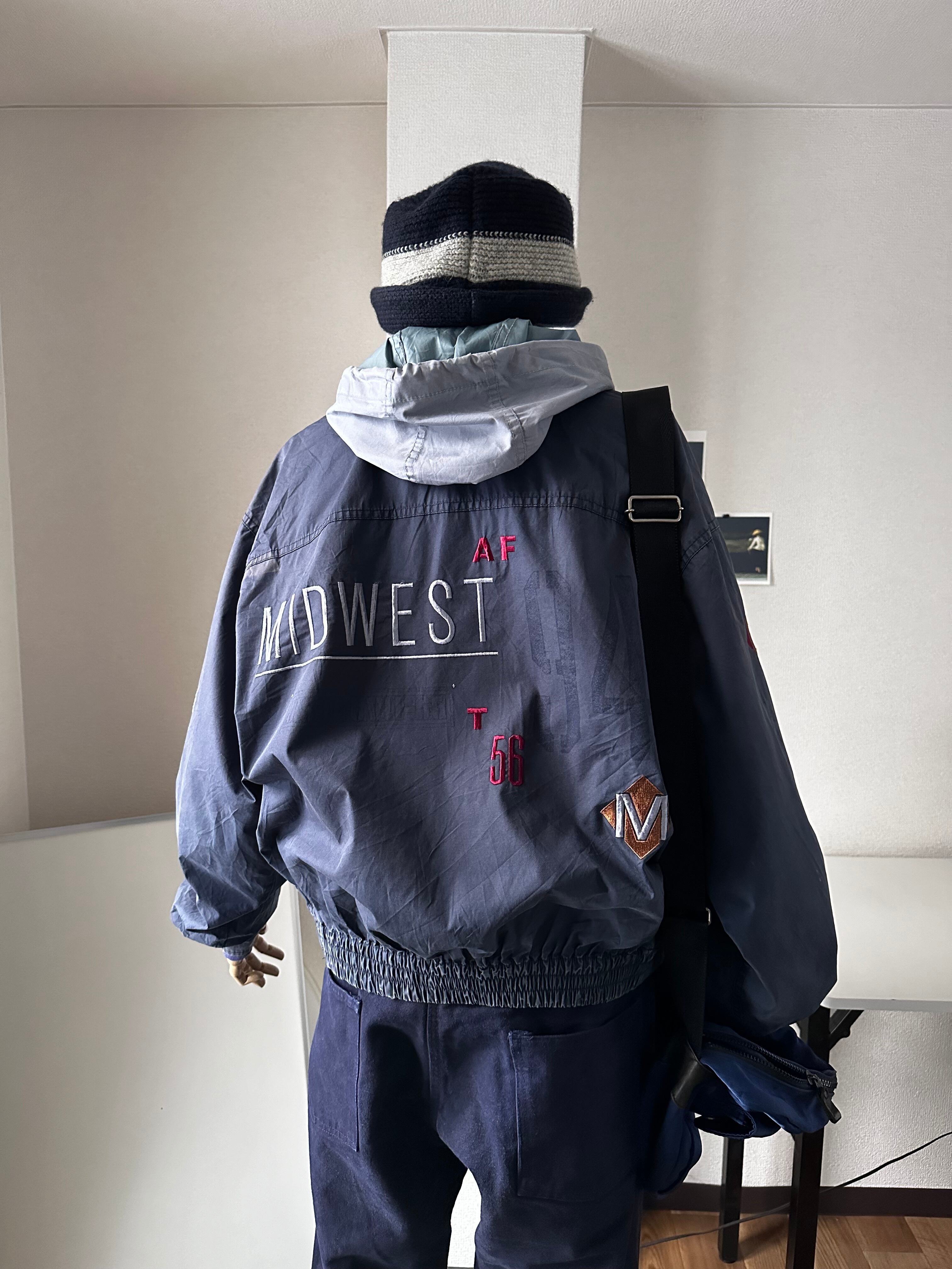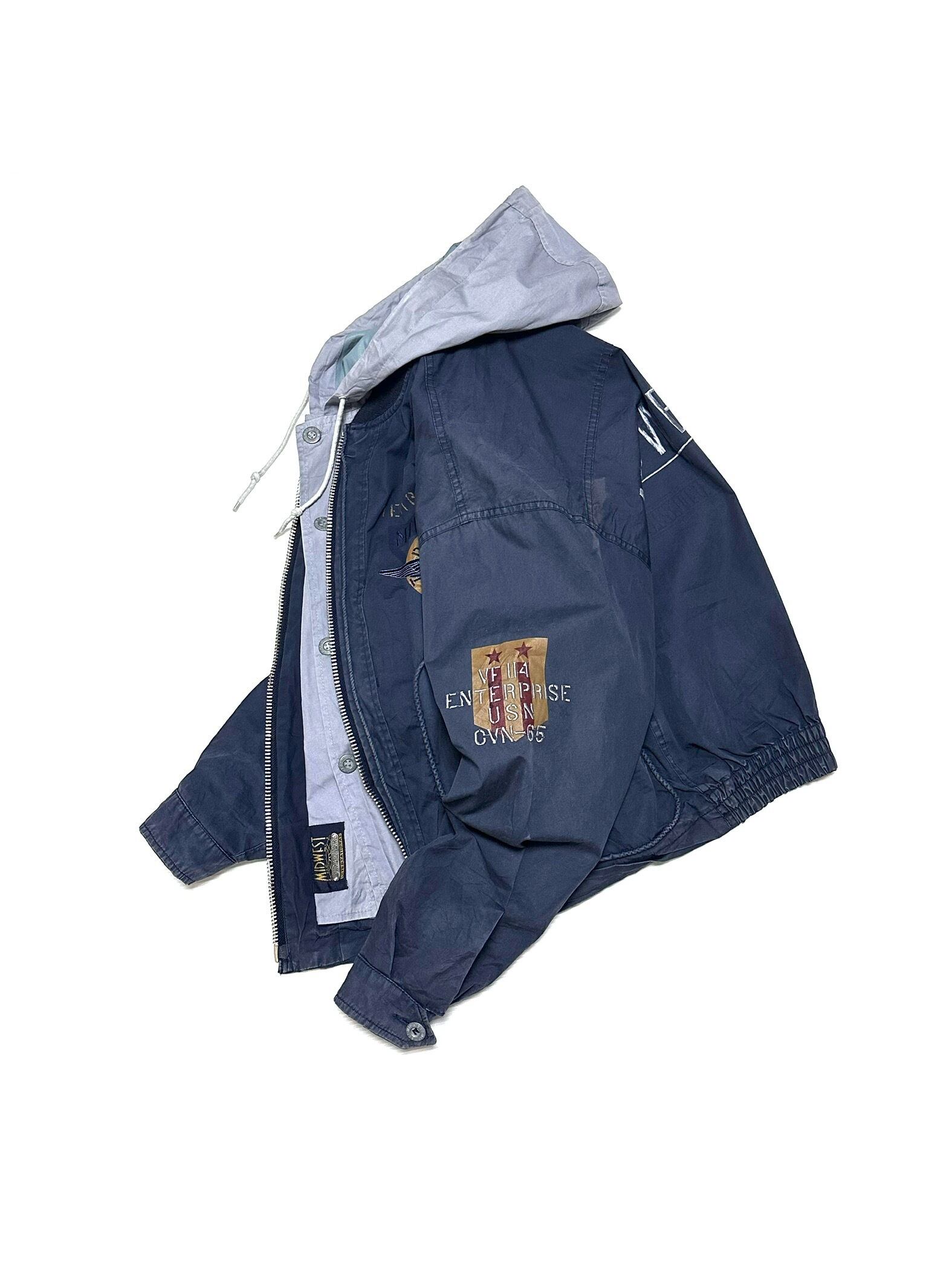 フェードの効いたネイビーのフライトジャケットと、タイプライター系のハイカウントコットン仕立てのパーカーをフェイクレイヤードしたデザイン。