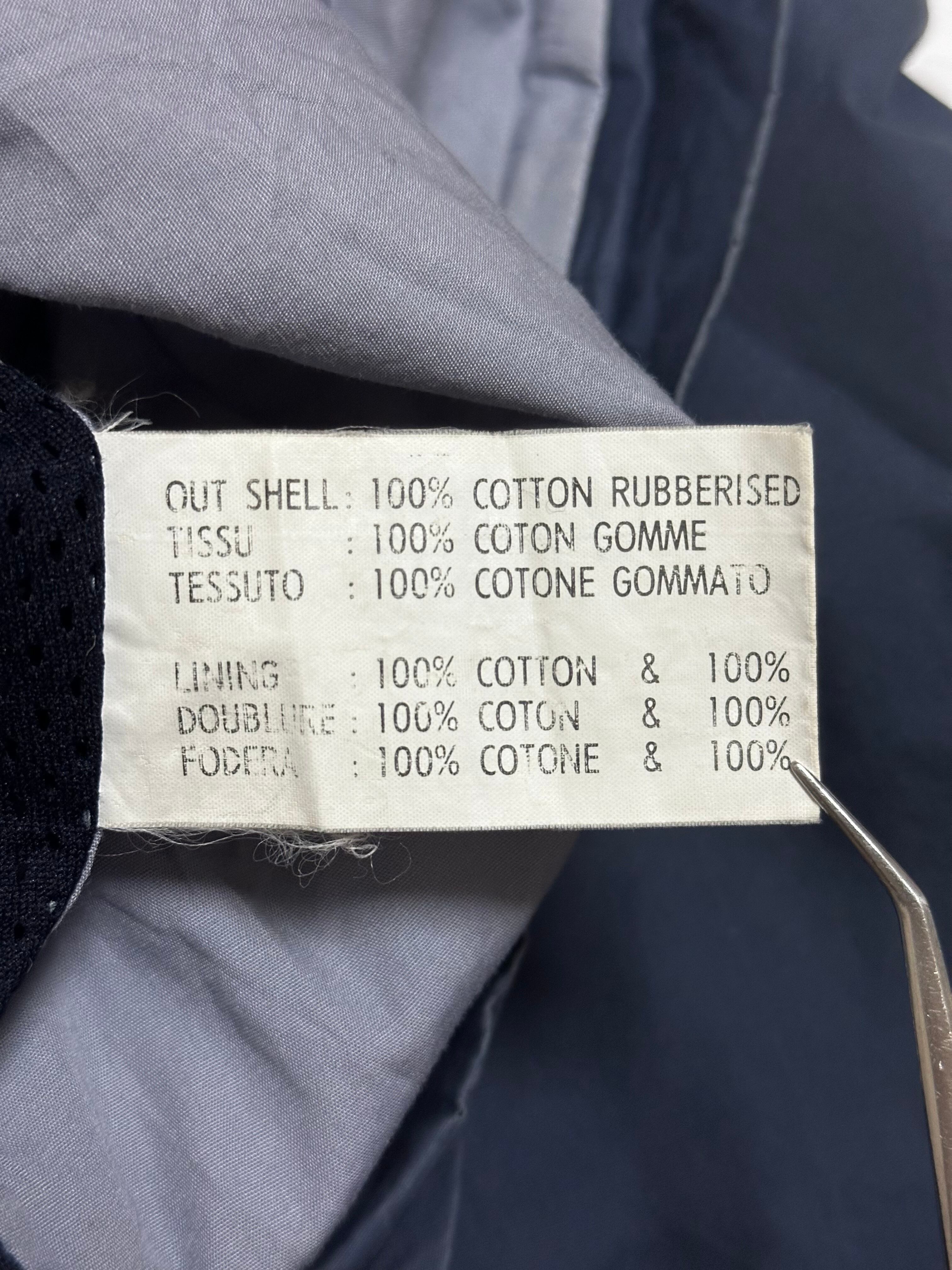 アウターのネイビーよりも数段明るいペールブルーの軽やかな生地に、ゴロッと重たいメタルボタンのコントラスト。