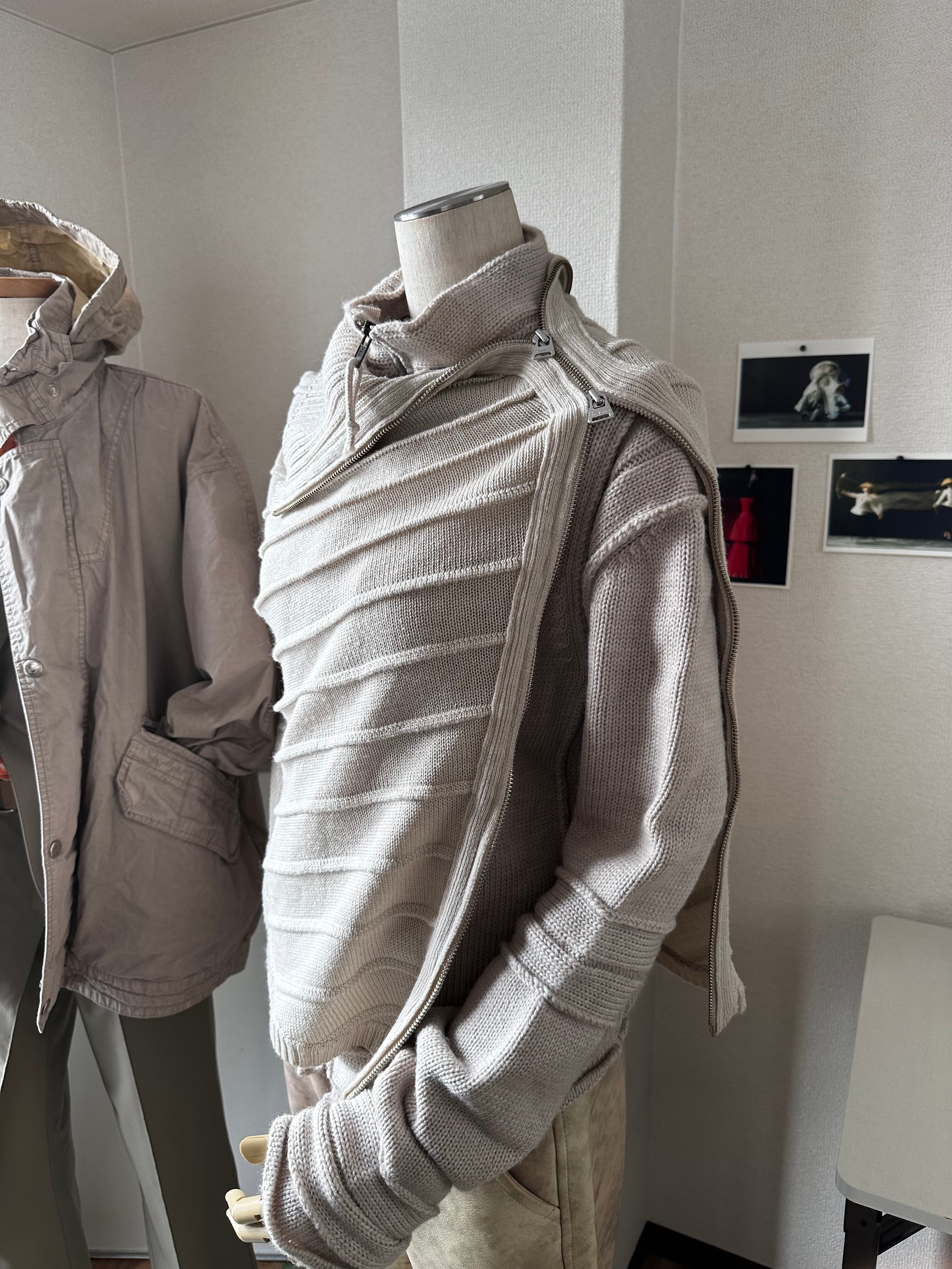 また、ニットウェアではノイズとなるジップの周りを丁寧にこれまたニットでカバーし切っているのも美しい。