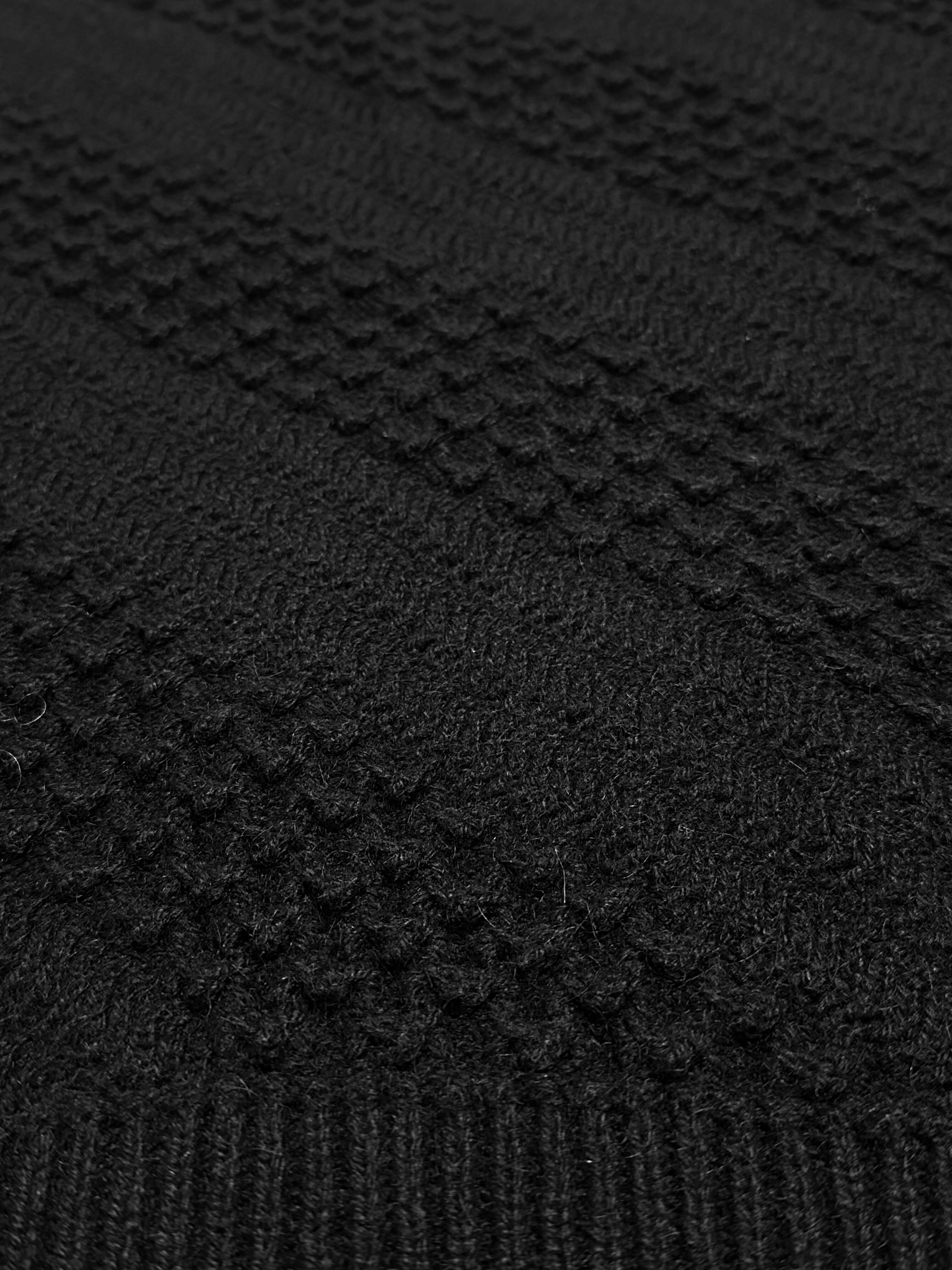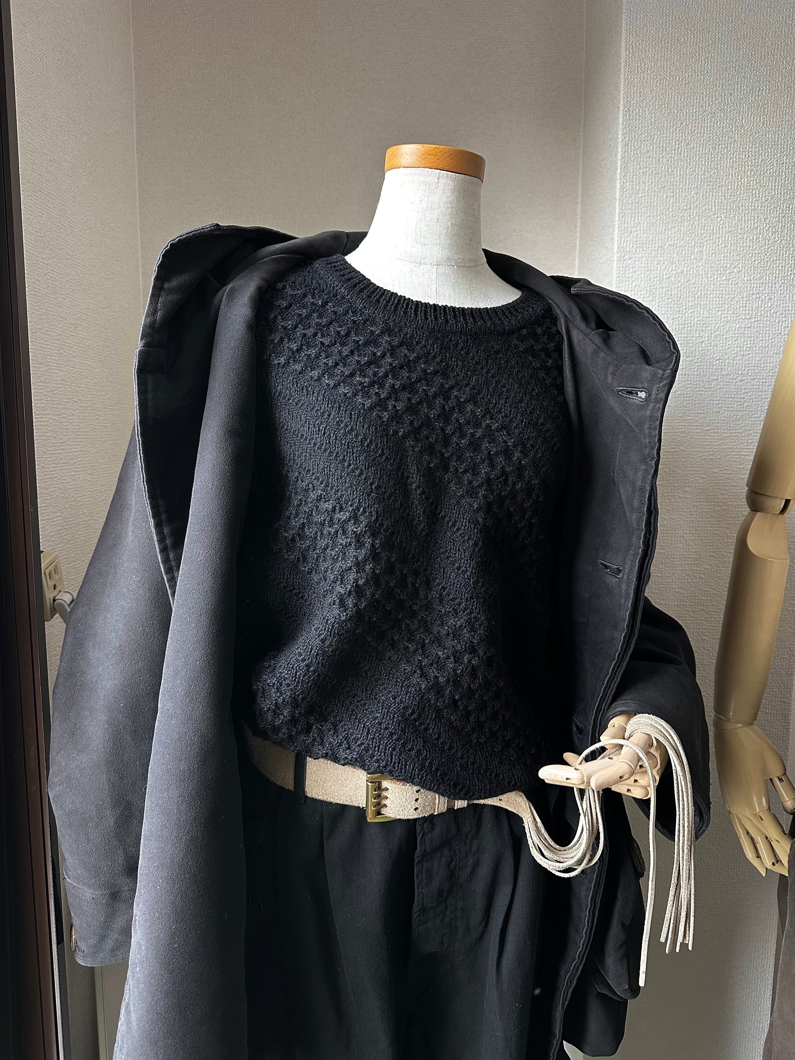 強い凹凸に富んだ立体的な編み地が巧みに混ぜられた、総編柄のブラックニット。