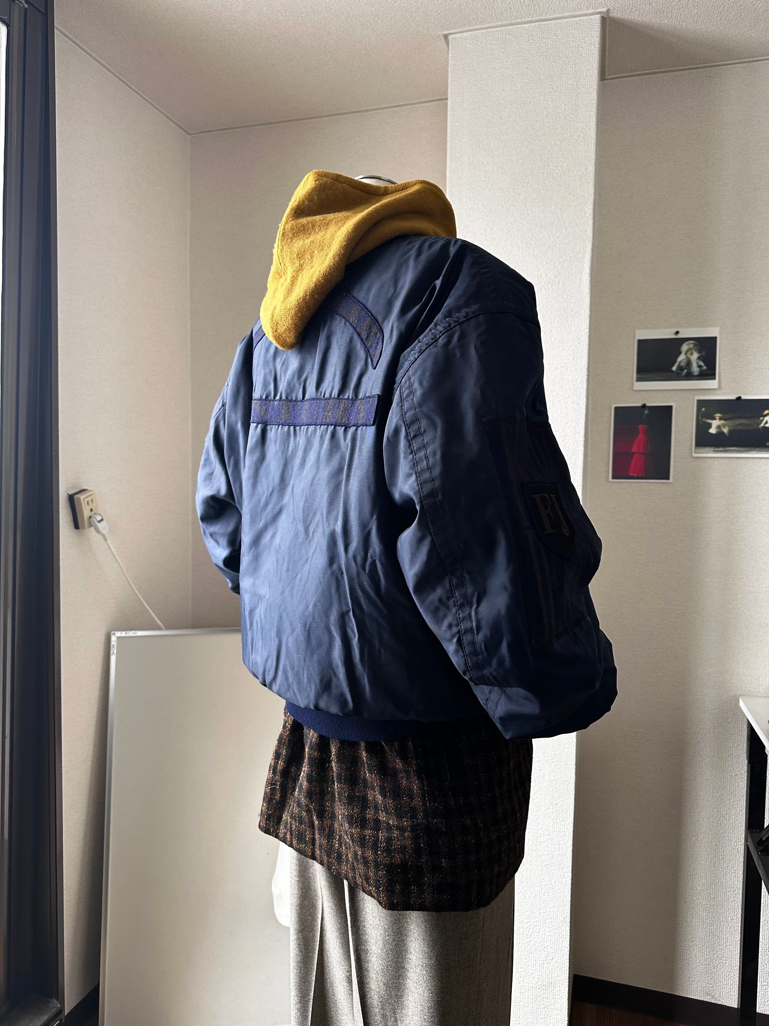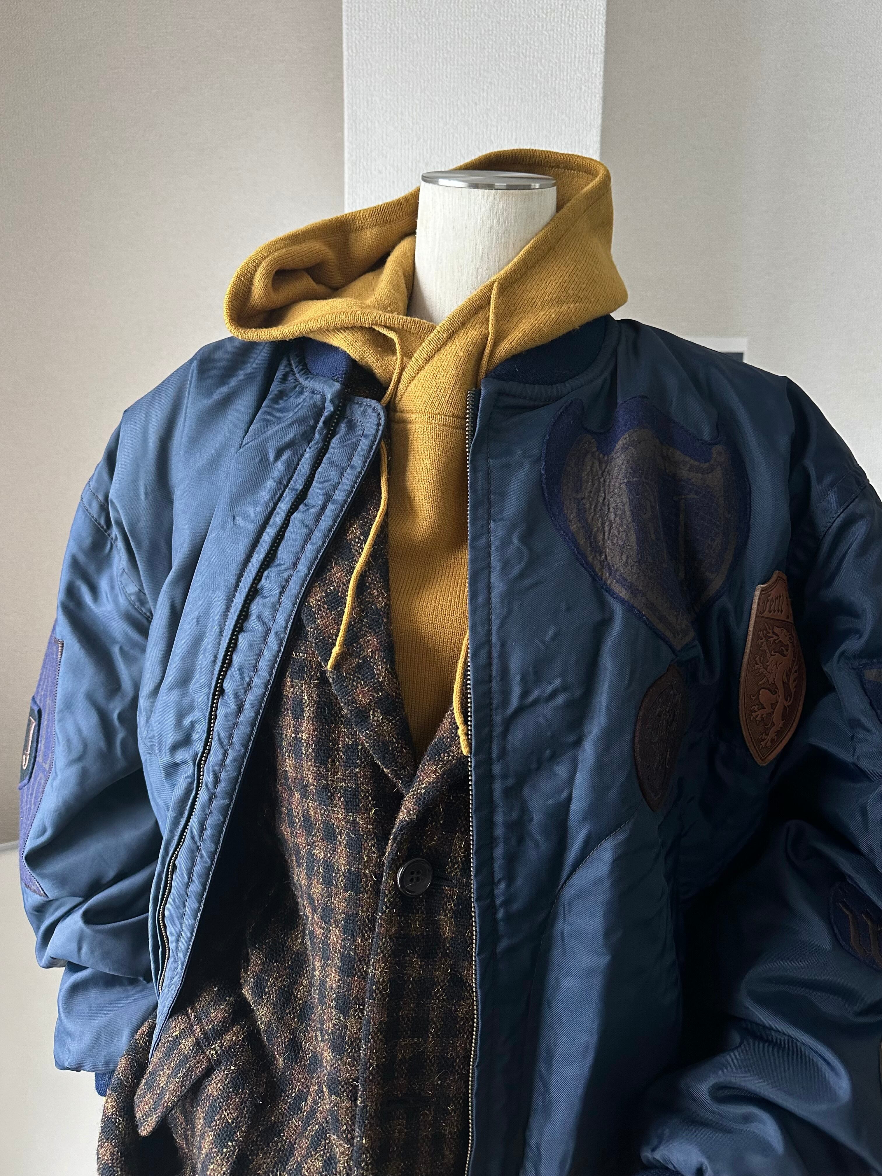 現代だとみんな(私含めて)如何に綺麗に肩を落とすかって部分を重んじますから、ボマージャケットにこうした素材を選ぶのは新鮮。