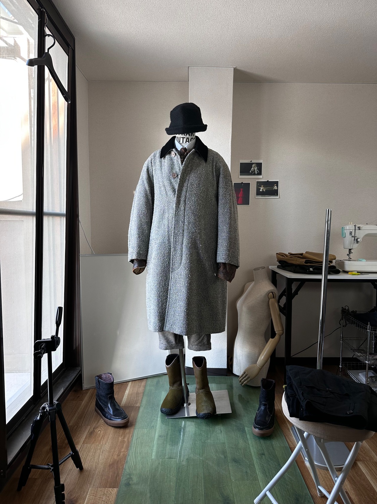 核心は、可愛らしいブークレ・ツイードをメンズウェアに採用して途轍もなくダンディな外套に仕上げてしまっているところ。