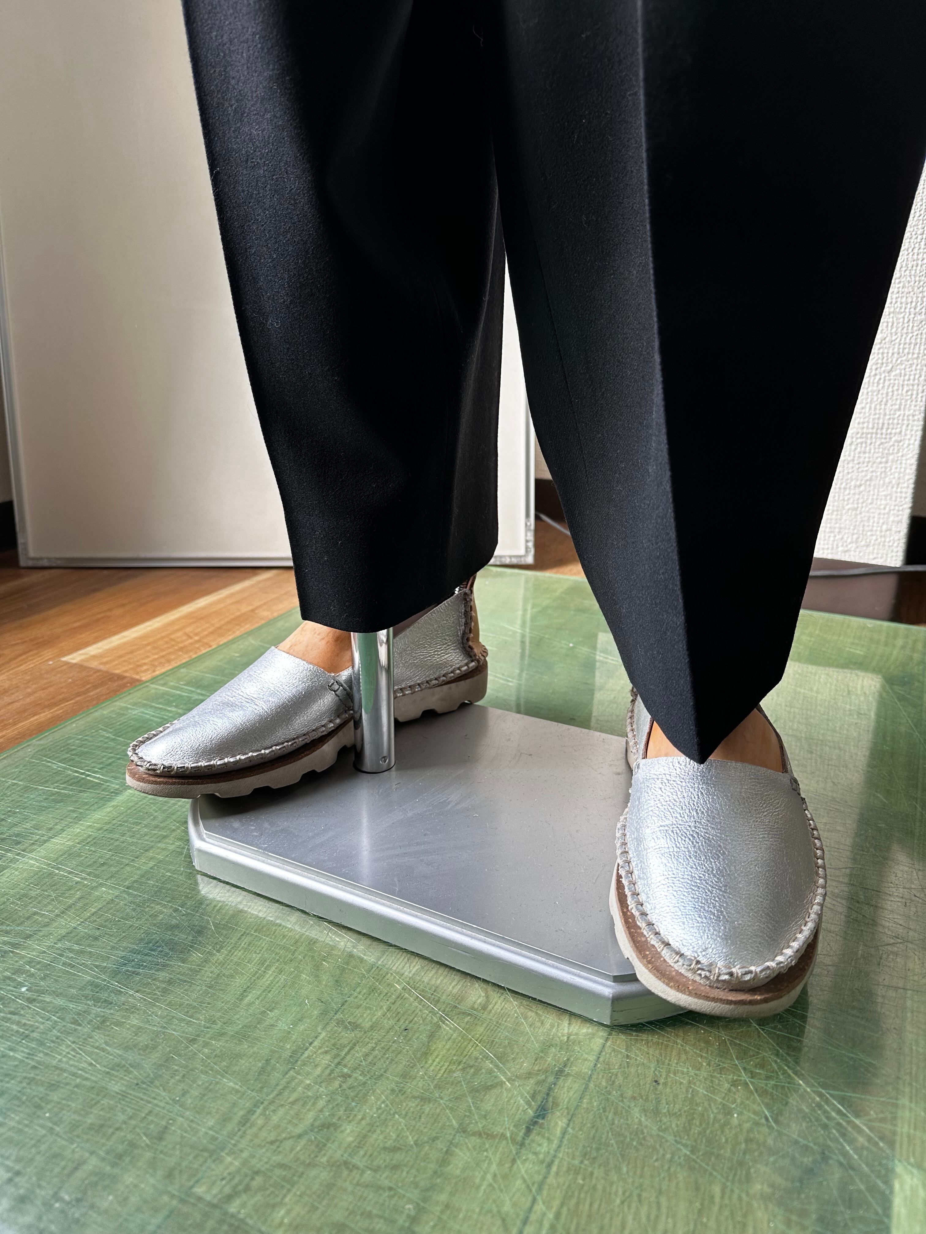 Versaceが脚の付け根から放射状に、一点透視図法みたいなイメージでタック設計をしているのに対して、MASATOMOのタック設計はもっと平面的。