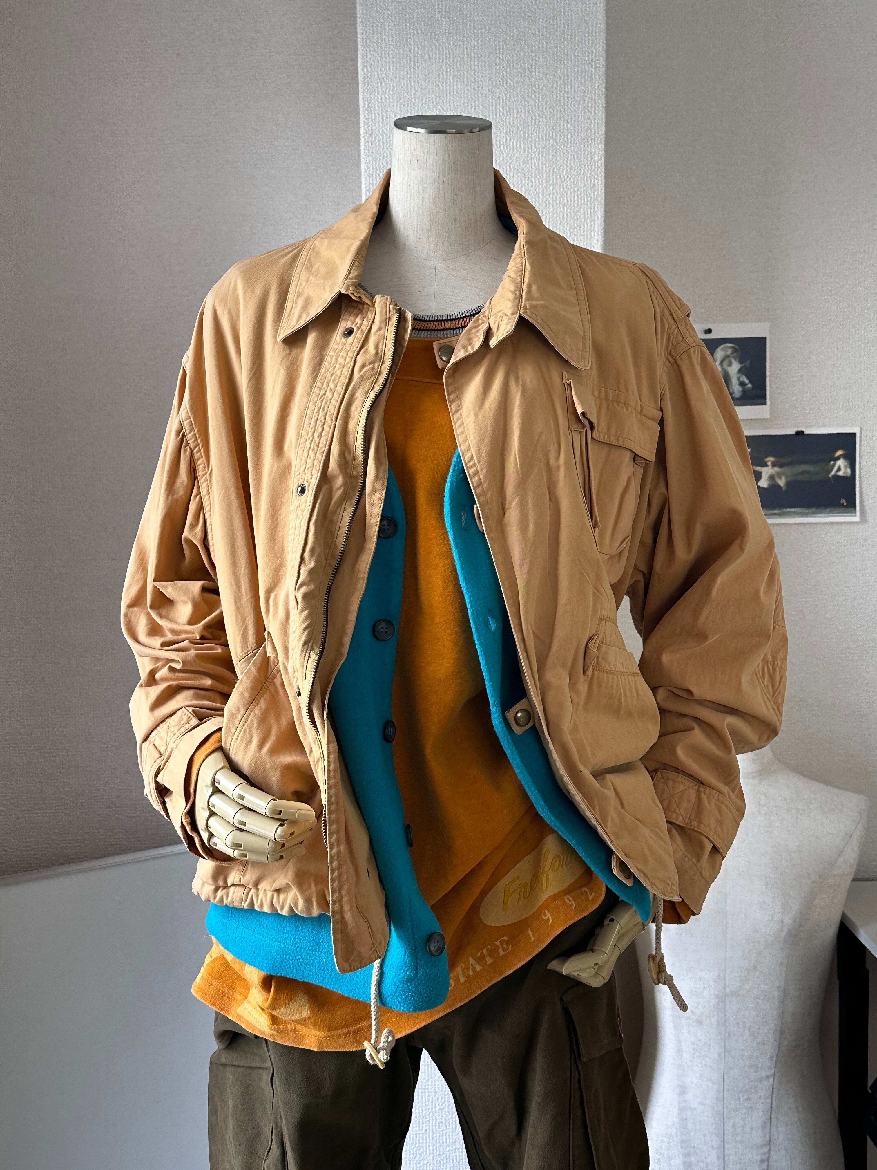 イタリアン・カジュアルのハードな色使いを仄めかしつつ、地味なアースカラーのアウター&パンツで面積調整。